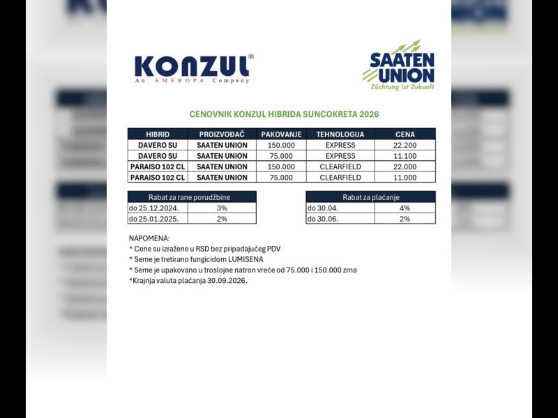 Saaten Union je nemačko-francuski brend osnovan 1965. godine, poznat po razvoju inovativnih hibrida žitarica i uljarica. U Srbiji je prisutan kroz saradnju sa lokalnim distributerima i istraživačkim institutima, a njihovi hibridi suncokreta su prepoznati po stabilnosti i otpornosti u uslovima suše.